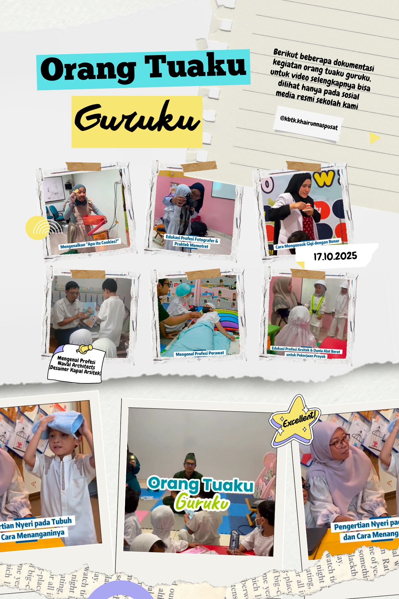Hari Jumat, 17 Oktober 2025 menjadi hari yang penuh makna dan keceriaan bagi anak-anak Daycare, KB, dan TK Khairunnas. Melalui kegiatan bertajuk “Orang Tuaku Guruku”, para orang tua tampil istimewa bukan sebagai pendamping di balik layar, melainkan sebagai guru sehari yang berbagi ilmu dan pengalaman seputar profesinya masing-masing.