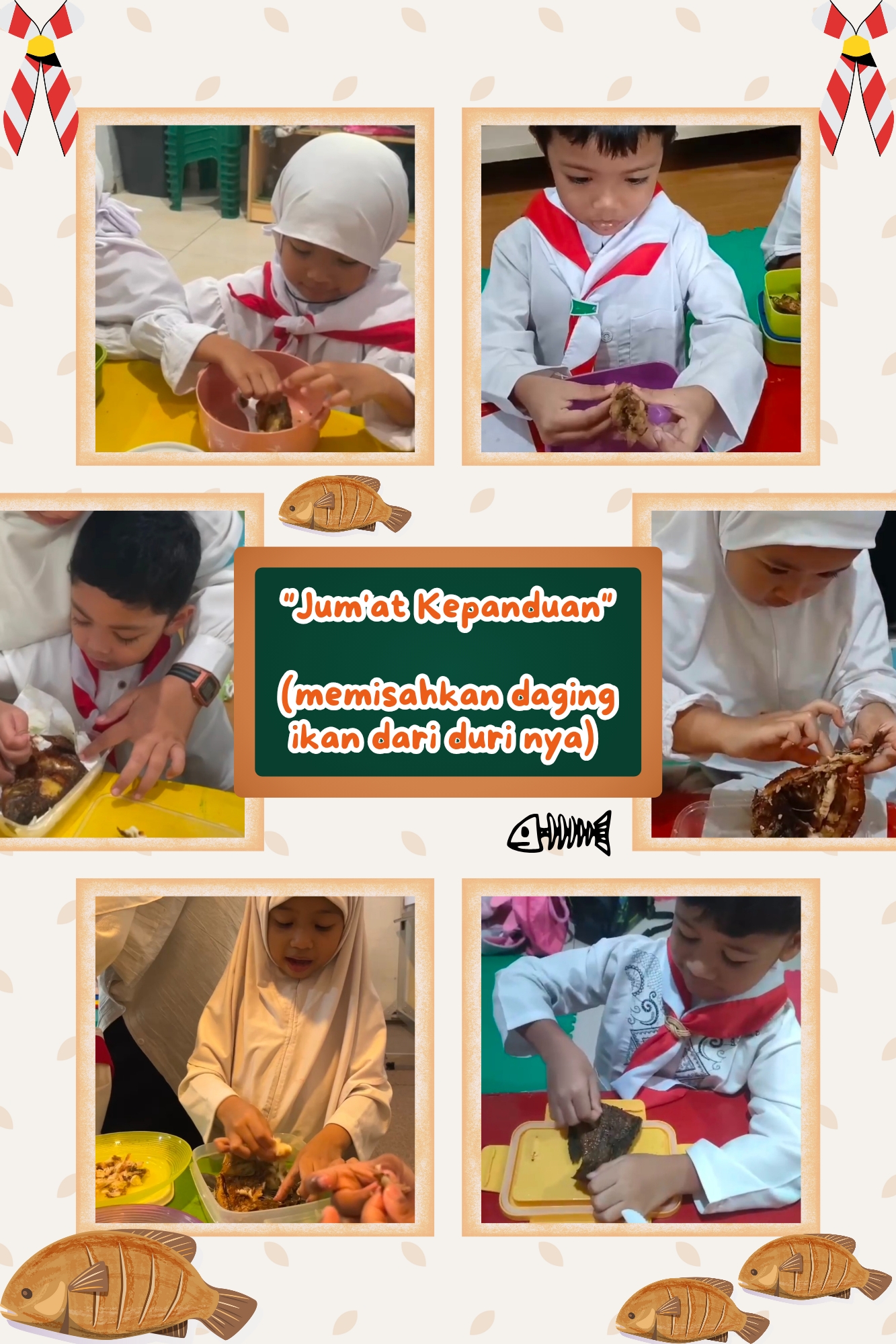 Jum’at Kepanduan di TK Khairunnas kembali menjadi momen penuh pembelajaran bermakna bagi anak-anak. Kali ini, para ustadzah mengajak anak-anak untuk belajar memisahkan duri dan daging ikan sendiri, sebuah kegiatan sederhana namun sangat bermanfaat untuk melatih kemandirian dan ketelitian sejak dini.