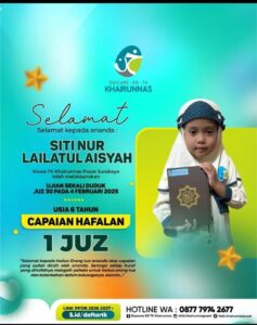 Selamat untuk Kak Nathania Nuha Ahbab yang telah mendapatkan gelar “Capaian Hafalan 1 Juz” yang dilaksanakan pada Selasa, 10 Desember 2024 dan Selamat untuk Kak Siti Nur Lailatul Aisyah mendapatkan gelar “Capaian Hafalan 1 Juz” yang dilaksanakan pada Selasa, 04 Februari 2025, keduanya didampingi langsung oleh kedua orang tuanya.