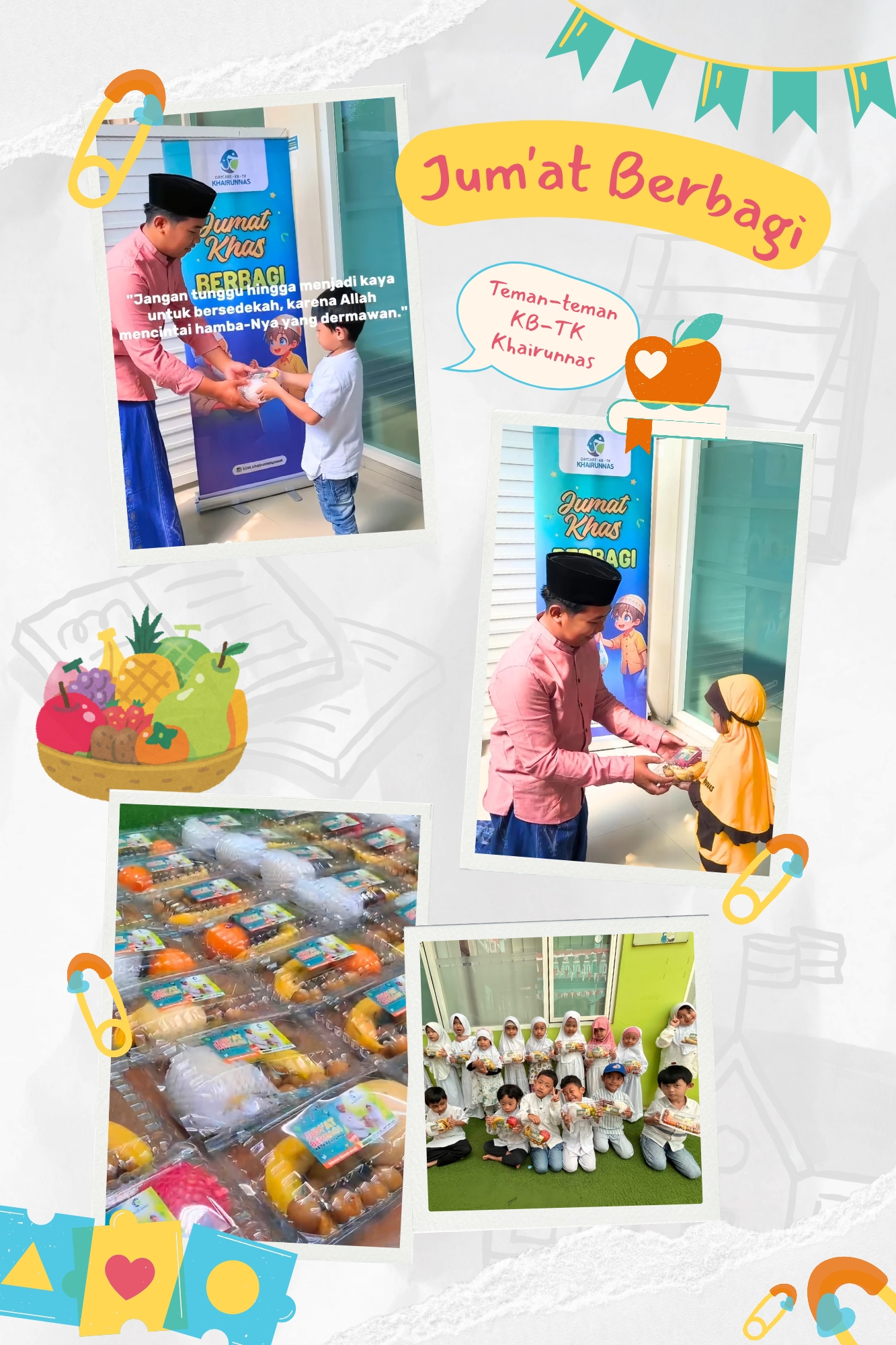 Kegiatan “Jum’at Berbagi” menjadi salah satu program rutin di KB-TK Khairunnas. Jika biasanya anak-anak berbagi nasi atau makanan berat, kali ini suasananya terasa berbeda. Jum’at ini, mereka belajar berbagi kebaikan lewat buah-buahan segar yang penuh warna dan manfaat.