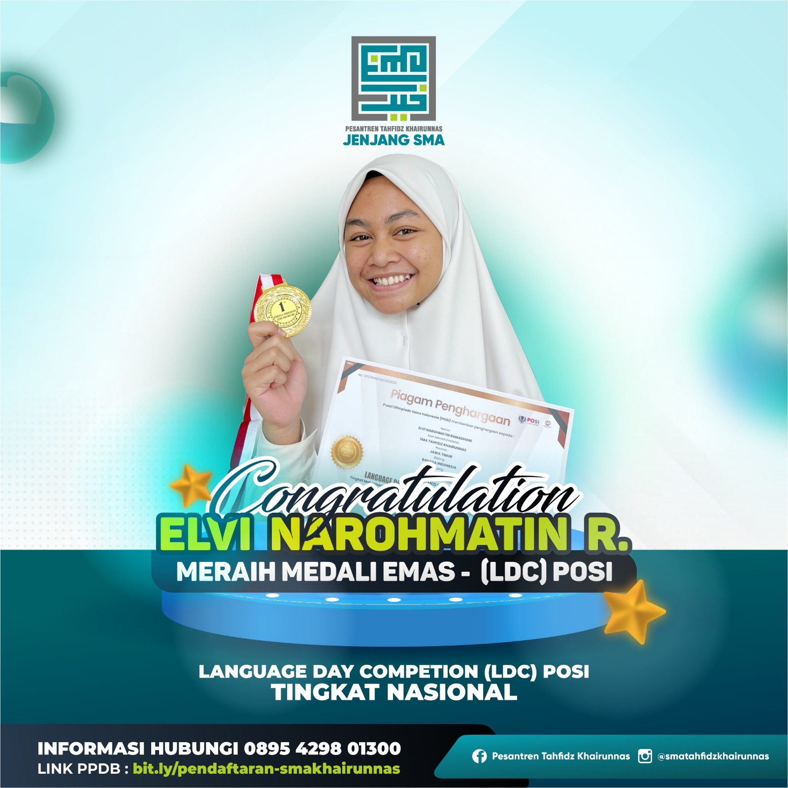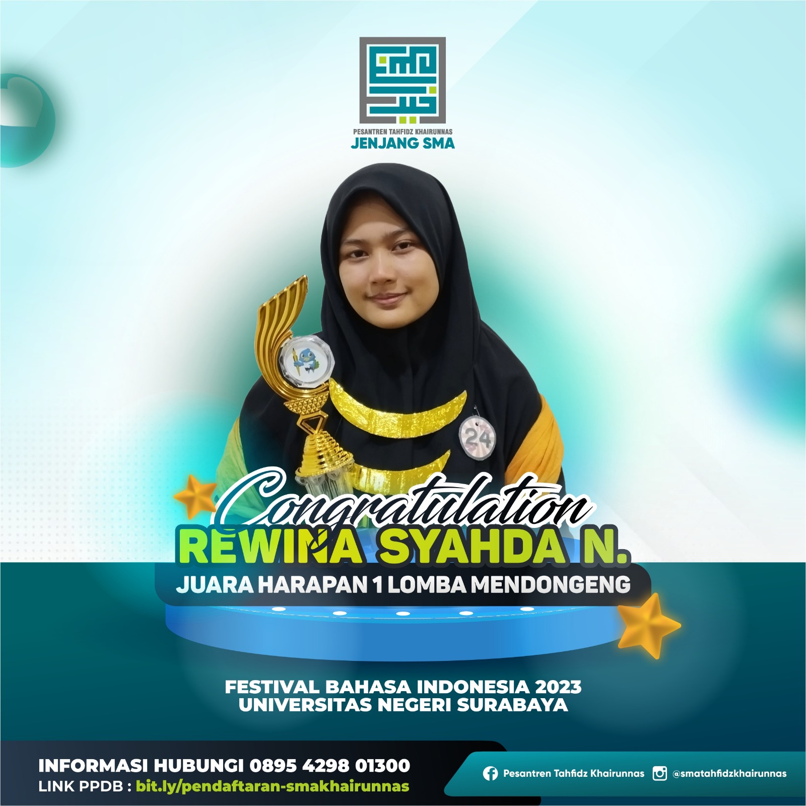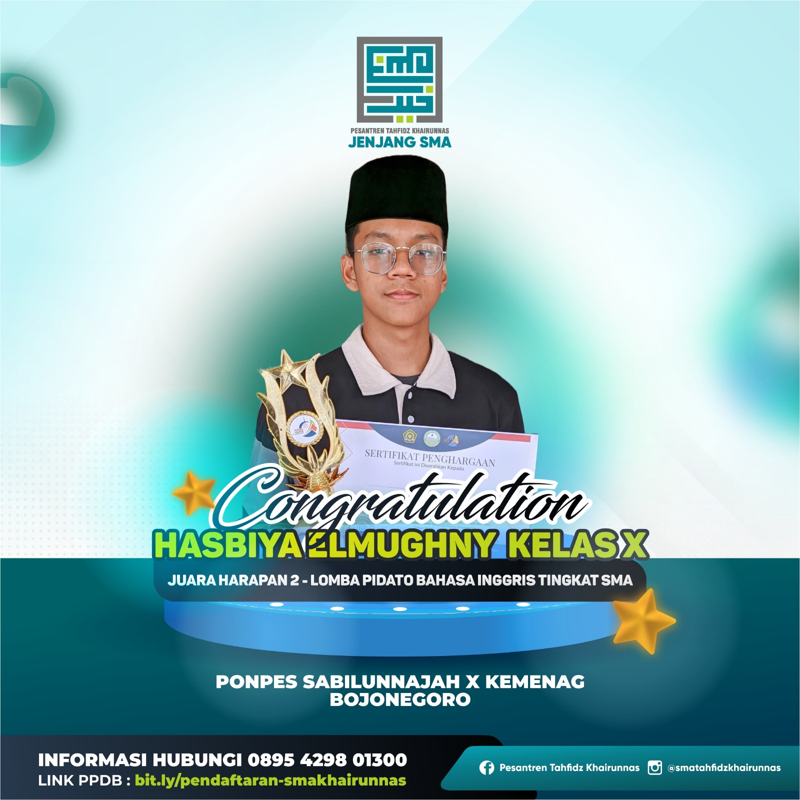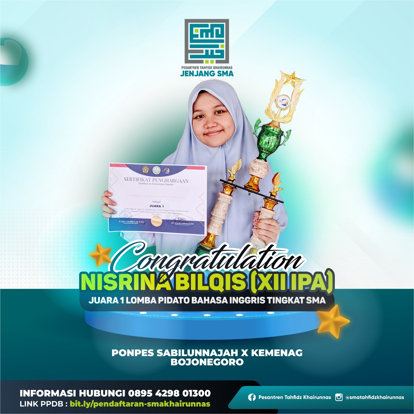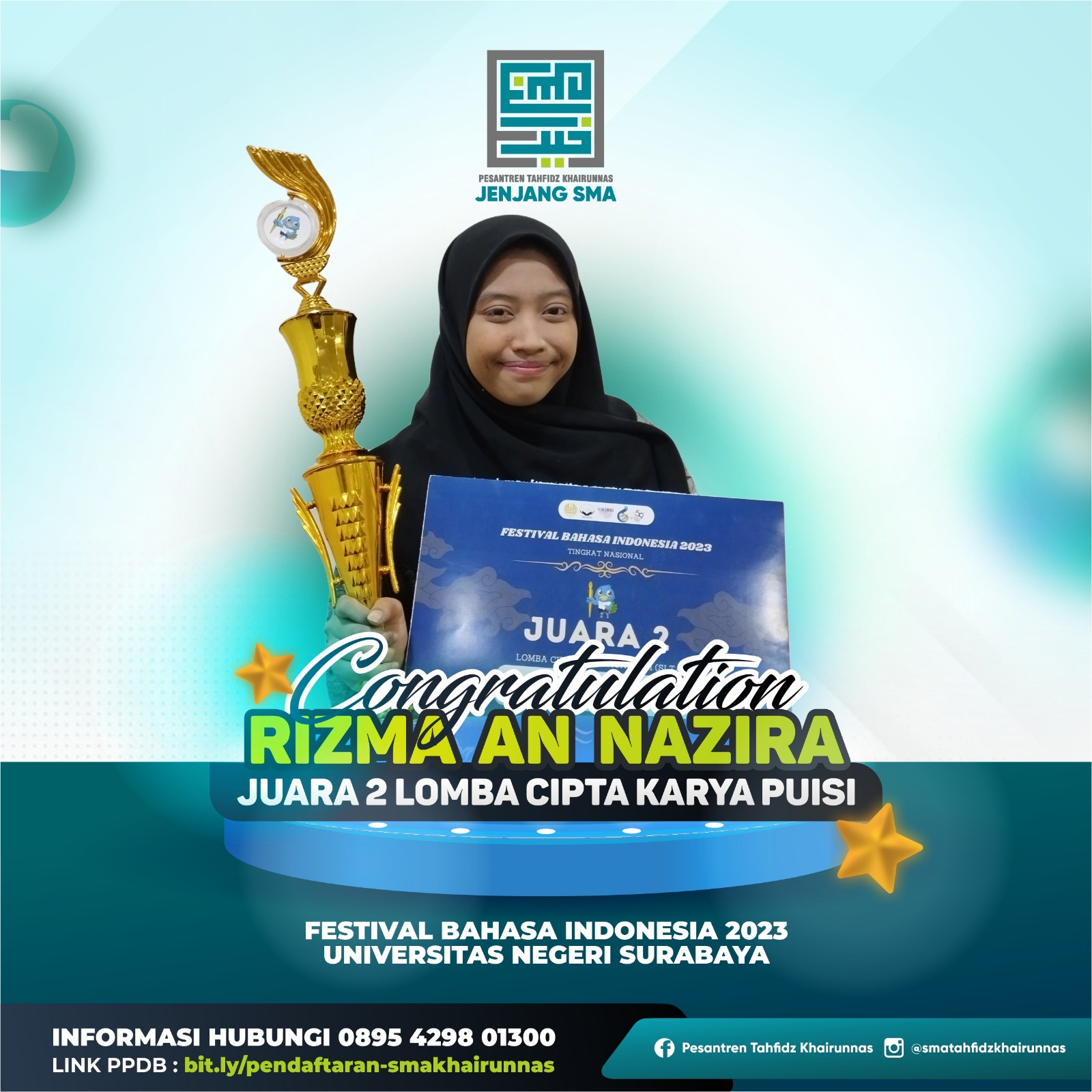 3. Nisrina Bilqis, X IPA, Juara Harapan 1 cipta puisi di sayembara cipta dan baca puisi “kidungan Anak Sidoarjo” diselenggarakan oleh Yayasan Akatara dan UNICEF