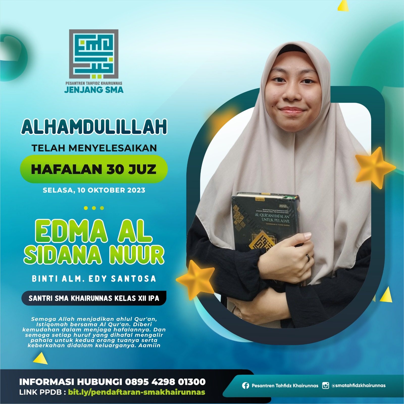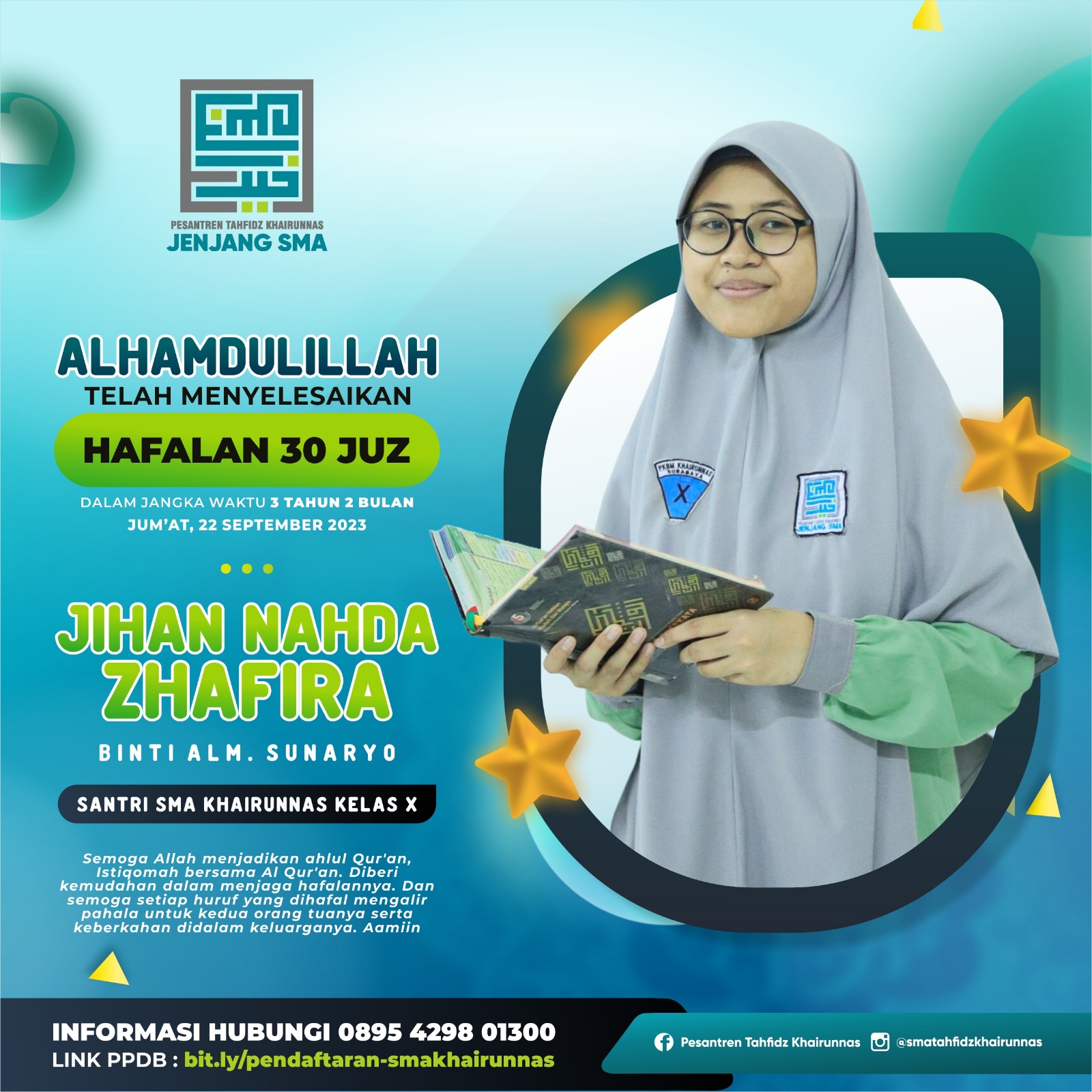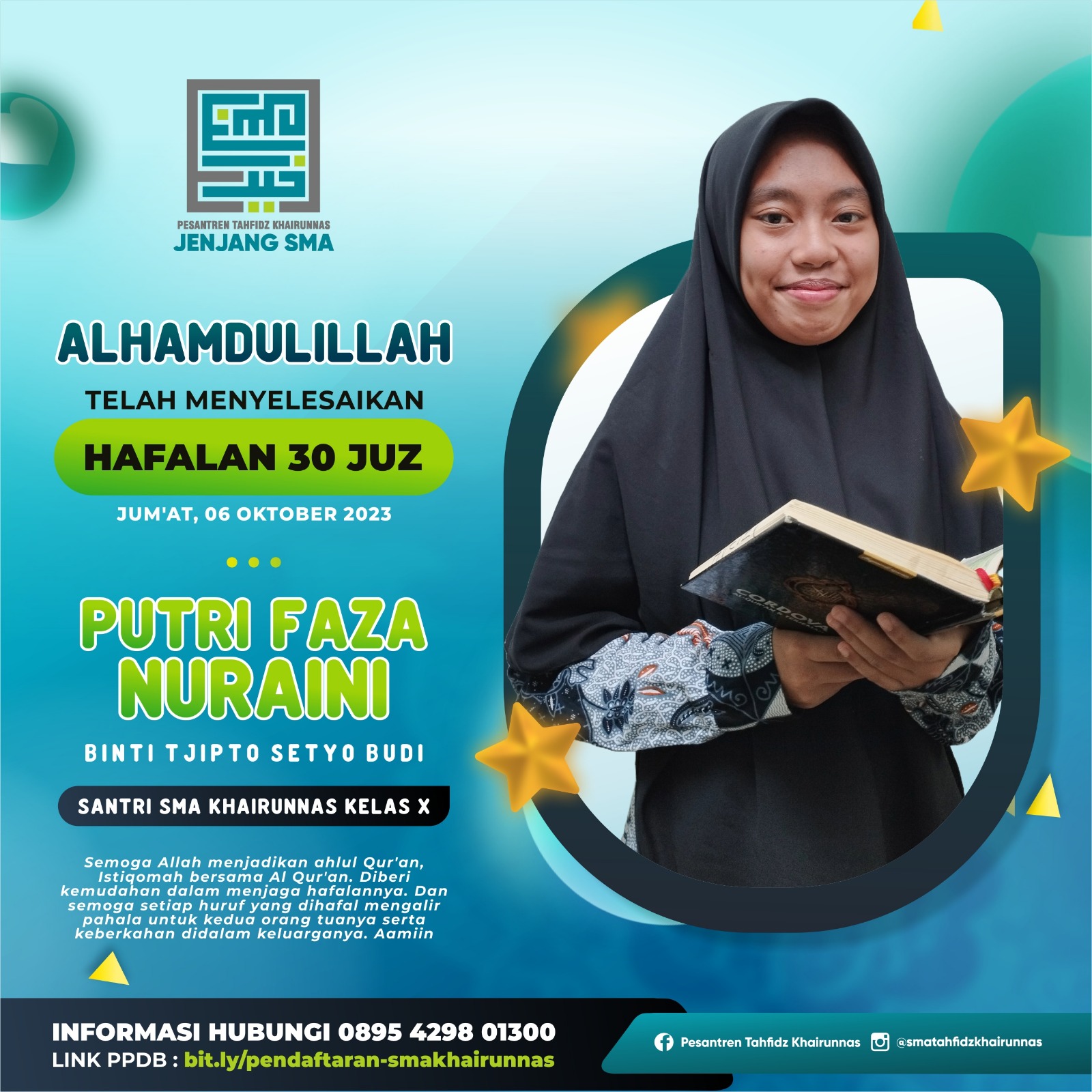 6. Arina Nur Hikmah, XII IPS, Hafal 30 Juz AlQur’an September 2021